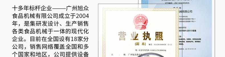 廣州旭眾食品機械有限公司是一家集科研開發(fā),生產(chǎn)設(shè)計,營銷服務(wù)為一體的現(xiàn)代化生產(chǎn)企業(yè)。現(xiàn)代化生產(chǎn)車間,精湛制造技術(shù),所產(chǎn)機械歷經(jīng)市場重重考驗,不斷贏得海內(nèi)外客戶的贊譽。