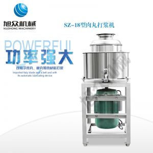 SZ-18型肉丸打漿機,本機裝肉用桶子采用不銹鋼制造,達到衛生要求,肉桶外罩和桶底裝有冷卻裝置,確保肉漿新鮮。比手工的打漿更精細,所產肉丸、魚丸彈性好,色澤潔白。